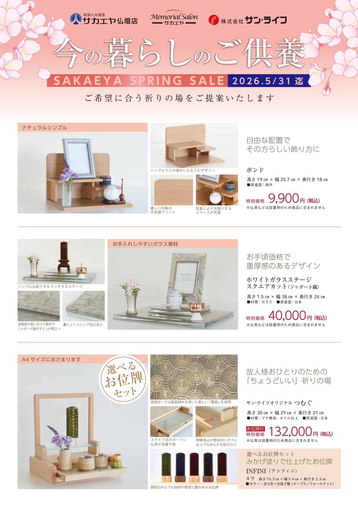 サカエヤ仏壇店では2026年5月31日(日)までスプリングセールを行っております。